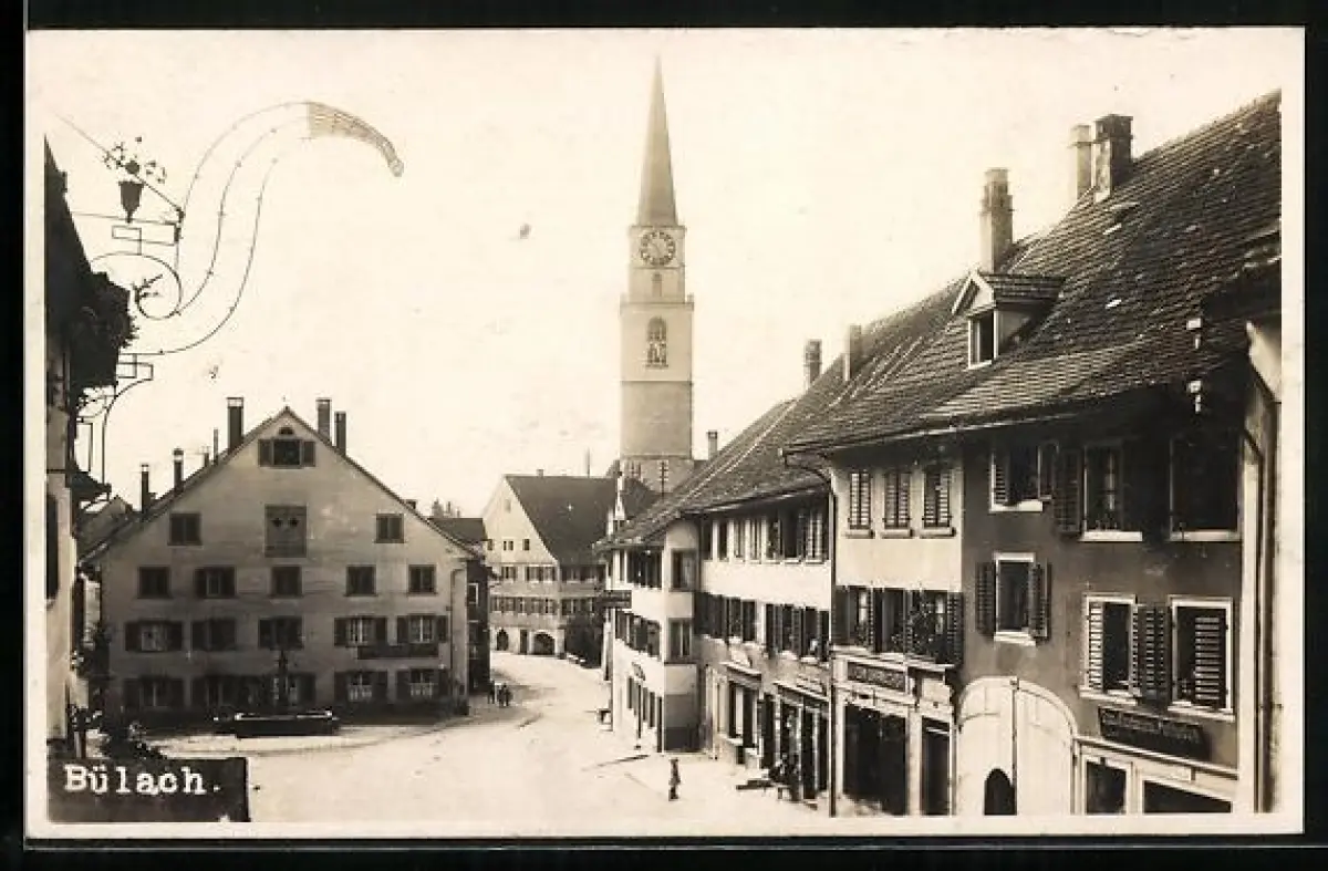 AK Bülach, Strassenpartie mit Geschäften u. Kirchturm aus der Vogelschau