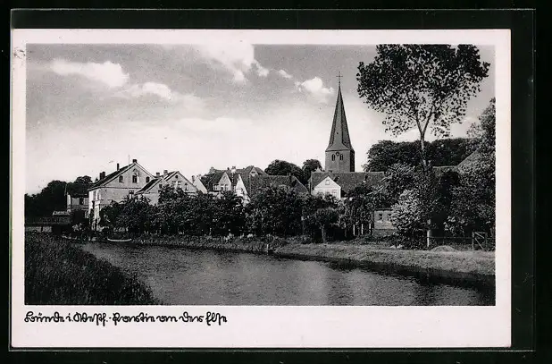AK Bünde i. W., Partie am Ufer der Else, Blick zum Kirchturm