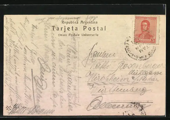 Personenbezogene Daten auf der Rückseite der Karte wurden durch blauen Textmarker unkenntlich gemacht. Die blauen Stellen sind auf die Vorderseite durchgeweicht und wirken sich negativ auf das Postkartenfoto aus