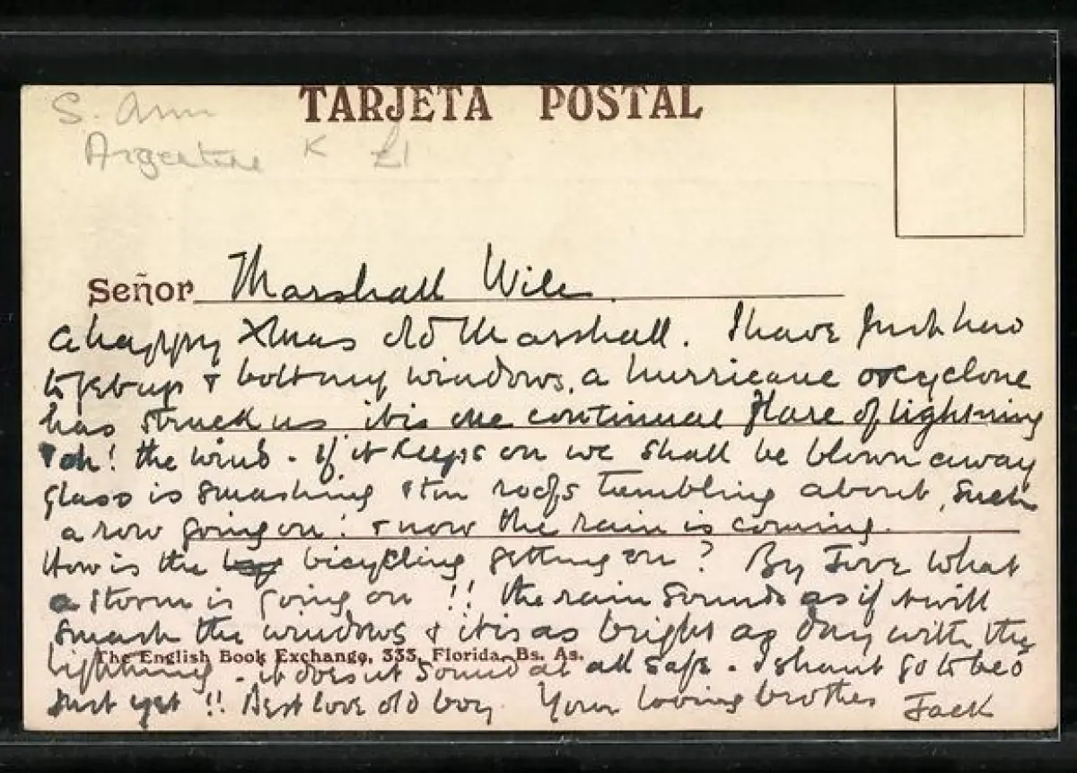 Personenbezogene Daten auf der Rückseite der Karte wurden durch blauen Textmarker unkenntlich gemacht. Die blauen Stellen sind auf die Vorderseite durchgeweicht und wirken sich negativ auf das Postkartenfoto aus