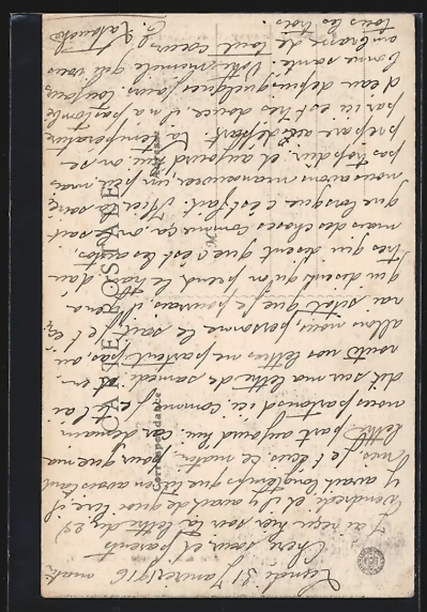 Personenbezogene Daten auf der Rückseite der Karte wurden durch blauen Textmarker unkenntlich gemacht. Die blauen Stellen sind auf die Vorderseite durchgeweicht und wirken sich negativ auf das Postkartenfoto aus