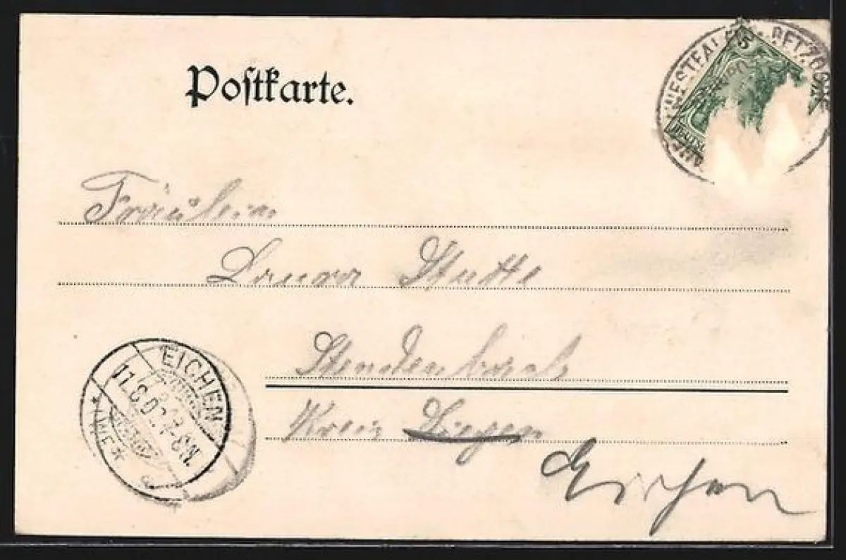 alte Ansichtskarte, gelaufen 1902, Briefmarke entfernt, rückseitig Oberflächenschaden, guter Zustand