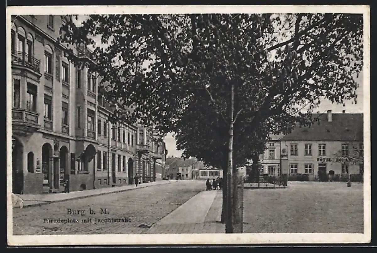 AK Burg b. M., Paradeplatz mit Jacobistrasse
