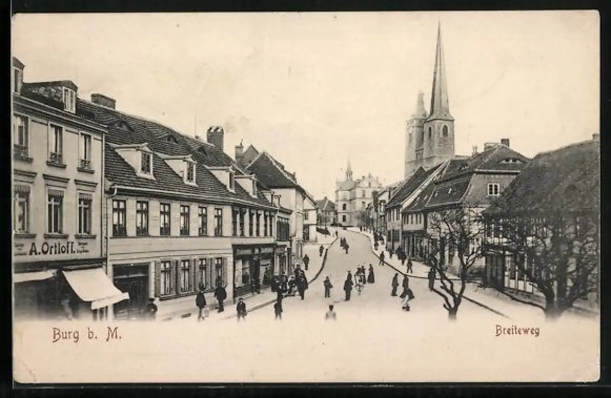 AK Burg b. M., Strassenpartie am Breiteweg mit Geschäften