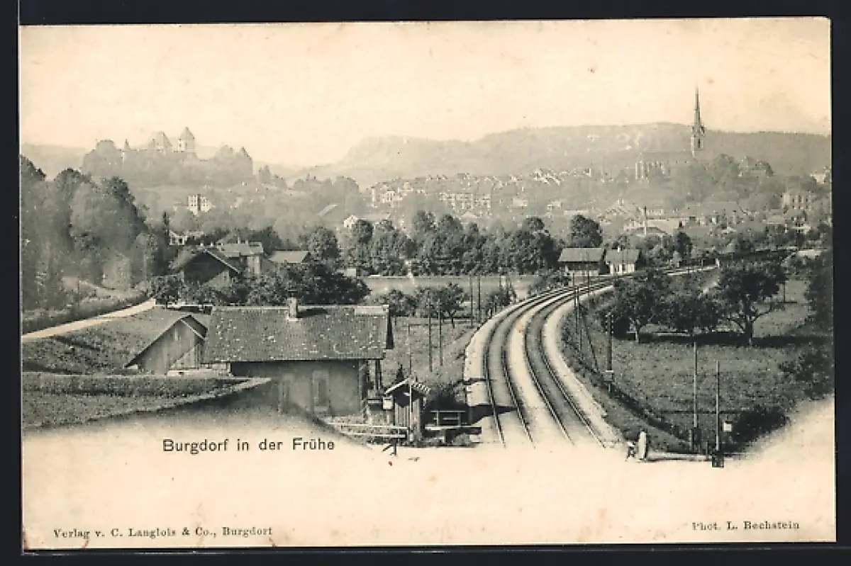 AK Burgdorf, Teilansicht mit Bahngleis in der Frühe