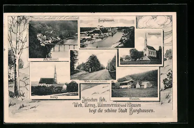 AK Burghausen, Ortsansicht mit Kreuz, Weh und Klausen