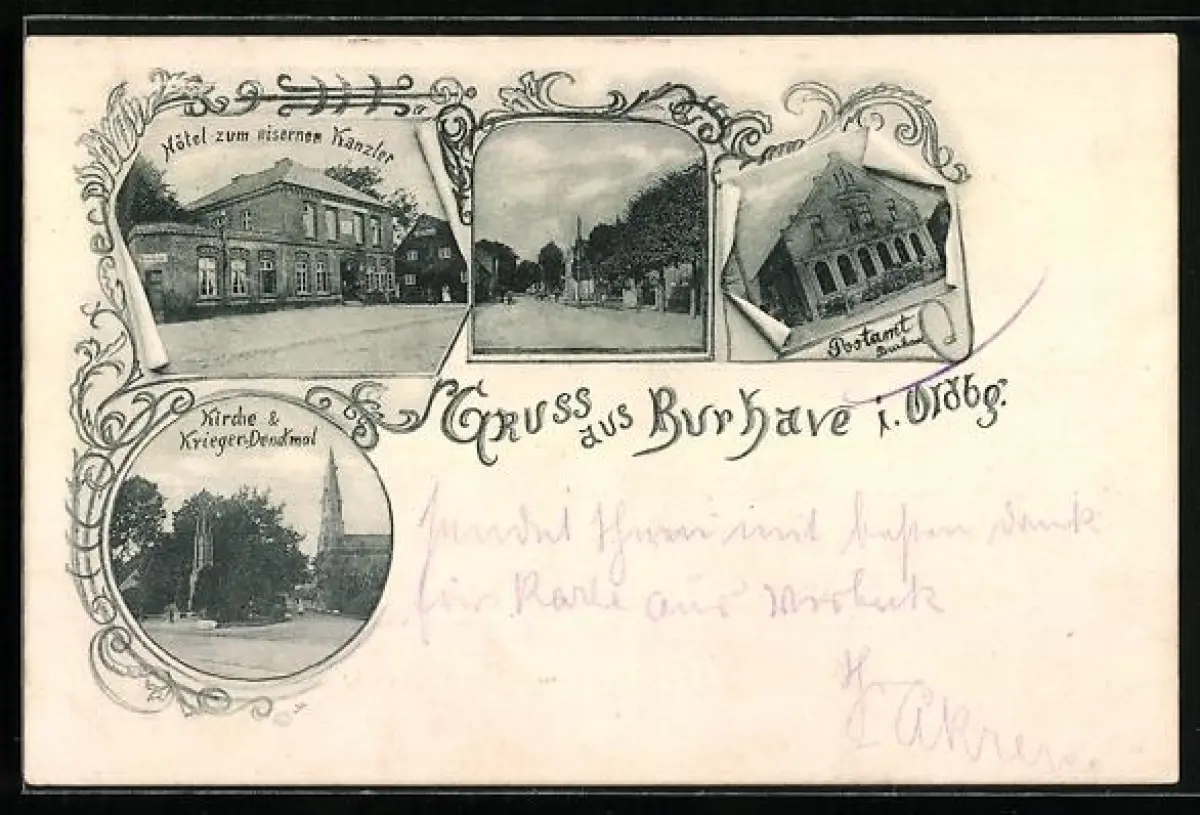 AK Burhave, Hotel zum eisernen Kanzler, Kirche und Krieger-Denkmal