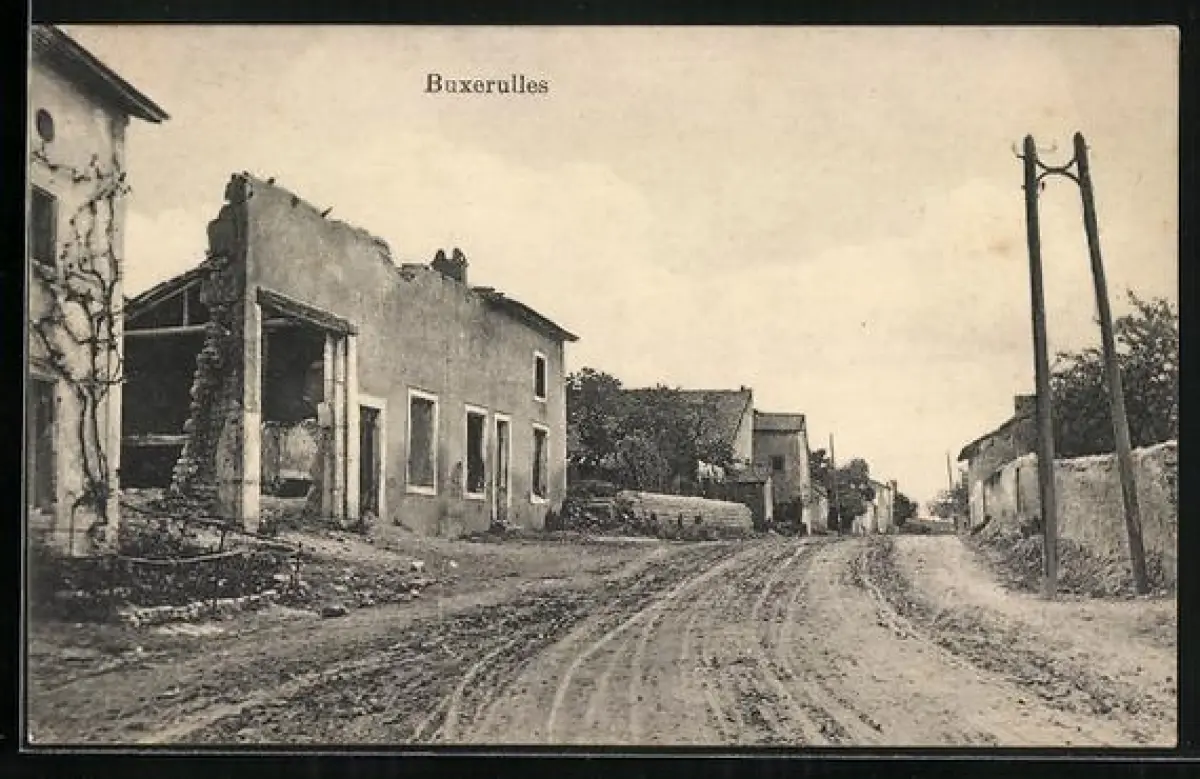 AK Buxerulles, Strassenansicht mit Häuserruinen
