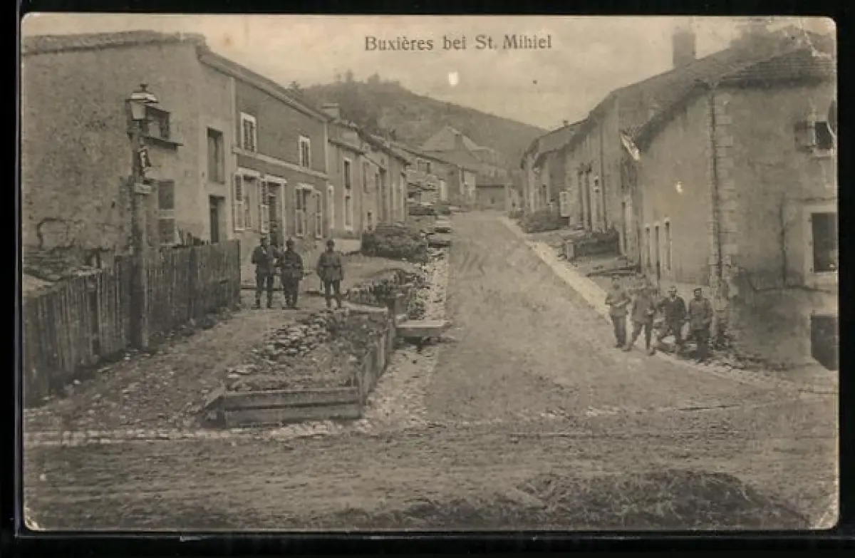 AK Buxiéres, Strassenpartie mit Wohnhäusern und Soldaten