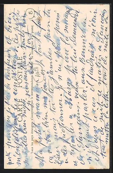 Personenbezogene Daten auf der Rückseite der Karte wurden durch blauen Textmarker unkenntlich gemacht. Die blauen Stellen sind auf die Vorderseite durchgeweicht und wirken sich negativ auf das Postkartenfoto aus