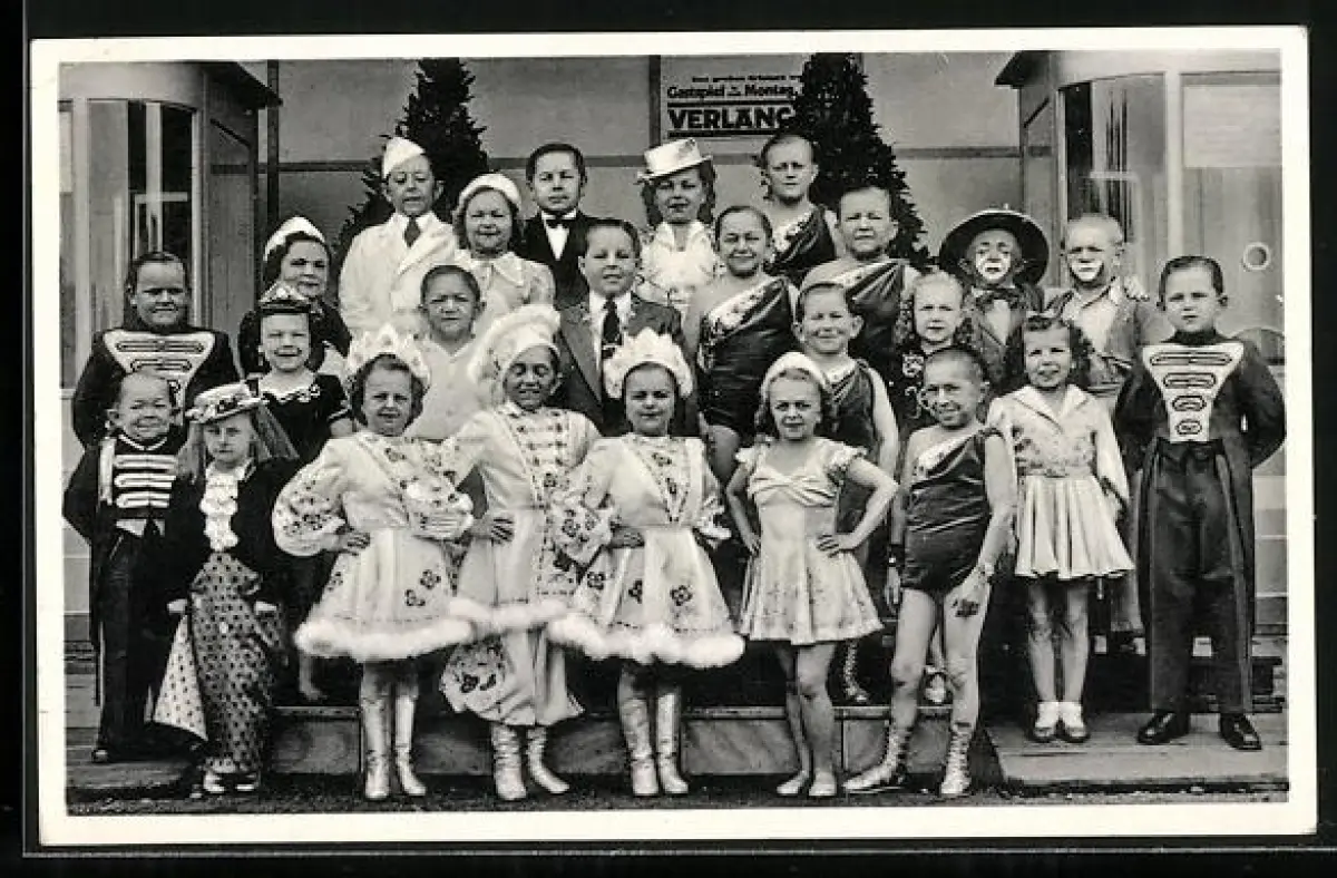 AK C. H. Schäfers Circus-Stadt Liliput, Gruppenaufnahme kleinwüchsiger Artisten, Liliputaner