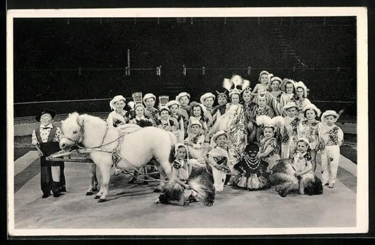 AK C. H. Schäfers Circus-Stadt Lilliput, Gruppenfoto mit einem Pony