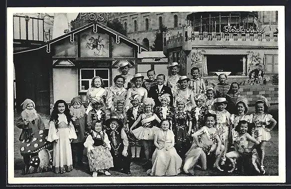 AK C. H. Schäfers Liliput-Circus-Stadt, Liliputanergruppe vor dem Glückswinkel