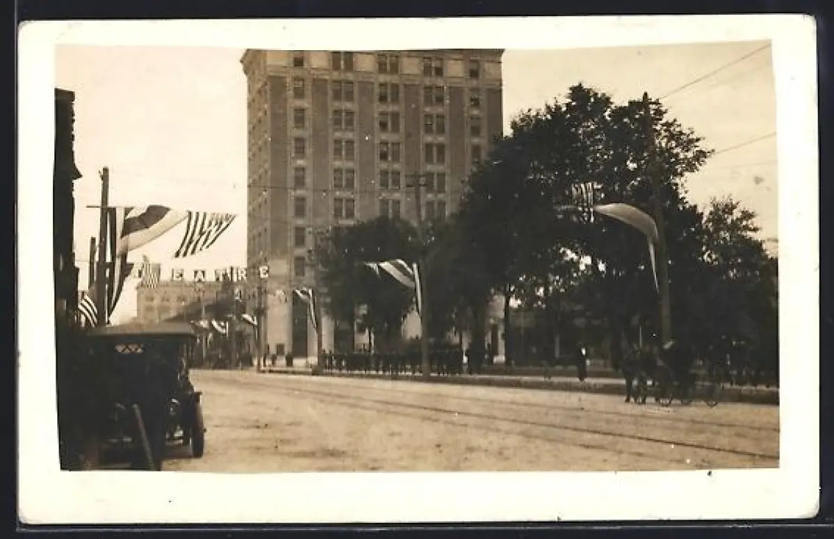 AK Caimanera, Strassenpartie mit Fahnen u. hohem Gebäude, Theater