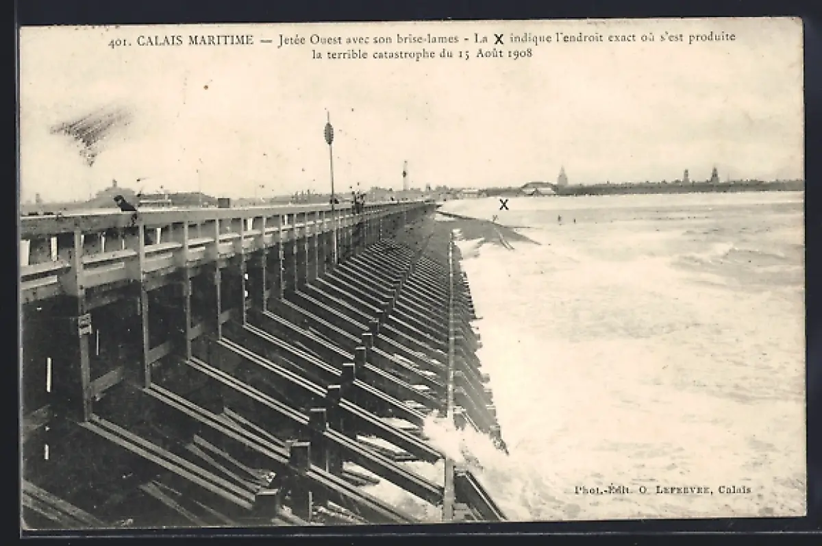 AK Calais Maritime, Jetée Ouest avec son brise-lames, La x indique l`endroit où s`est produite la catastrophe de 1908
