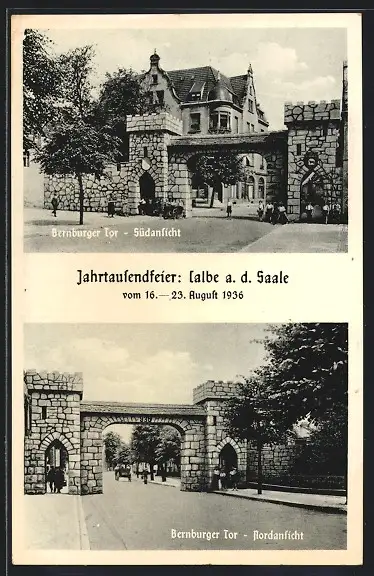 AK Calbe a. S., Jahrtausendfeier d. Stadt 1936, Bernburger Tor von Norden und Süden
