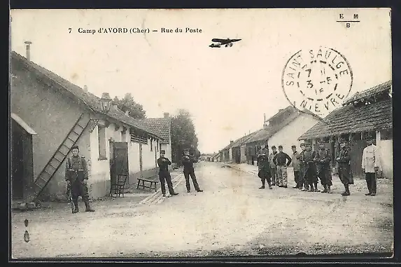 AK Camp d`Avord, Rue du Poste avec soldats et avion en vol