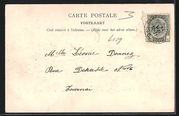 Personenbezogene Daten auf der Rückseite der Karte wurden durch blauen Textmarker unkenntlich gemacht. Die blauen Stellen sind auf die Vorderseite durchgeweicht und wirken sich negativ auf das Postkartenfoto aus