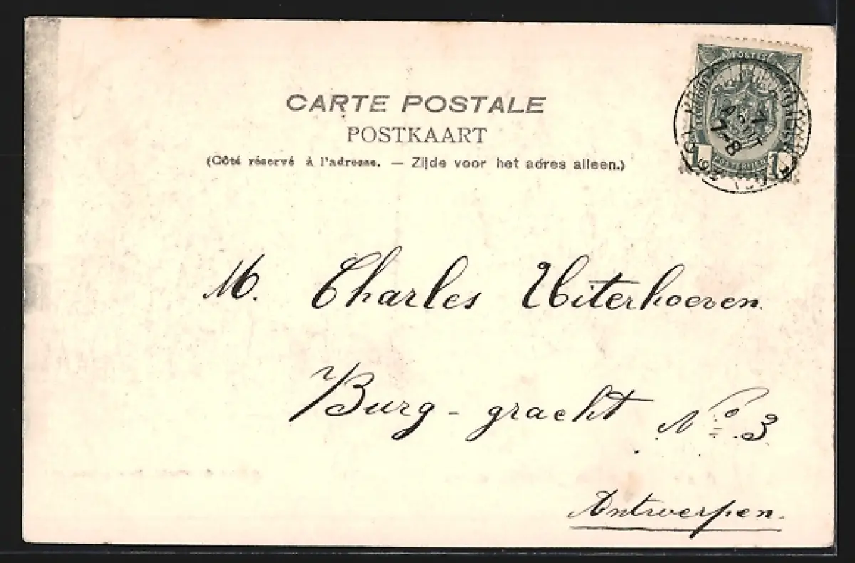 Personenbezogene Daten auf der Rückseite der Karte wurden durch blauen Textmarker unkenntlich gemacht. Die blauen Stellen sind auf die Vorderseite durchgeweicht und wirken sich negativ auf das Postkartenfoto aus
