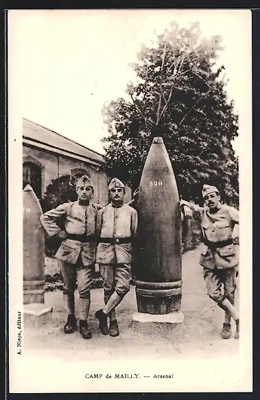AK Camp de Mailly, Arsenal, französische Artilleristen posieren neben Geschoss Kaliber 520mm