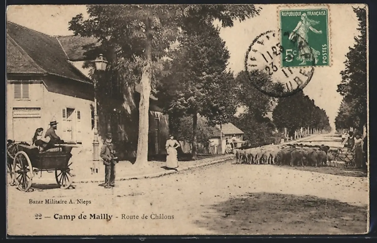 AK Camp de Mailly, Route de Châlons avec troupeau et charrette