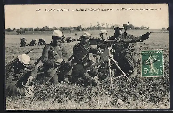 AK Camp de Mailly, Soldats d'Infanterie actionnant une Mitrailleuse en terrain decouvert