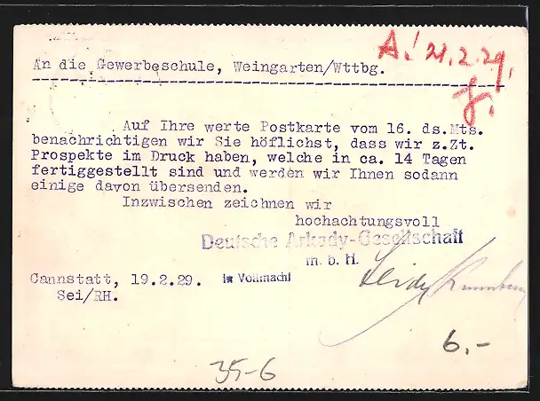 AK Cannstatt-Stuttgart, Reklame für Arkady Hefe Futter, Deutsche Arkady-Gesellschaft M. B. H., Pragstrasse 56