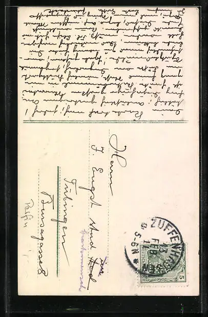 Personenbezogene Daten auf der Rückseite der Karte wurden durch blauen Textmarker unkenntlich gemacht. Die blauen Stellen sind auf die Vorderseite durchgeweicht und wirken sich negativ auf das Postkartenfoto aus