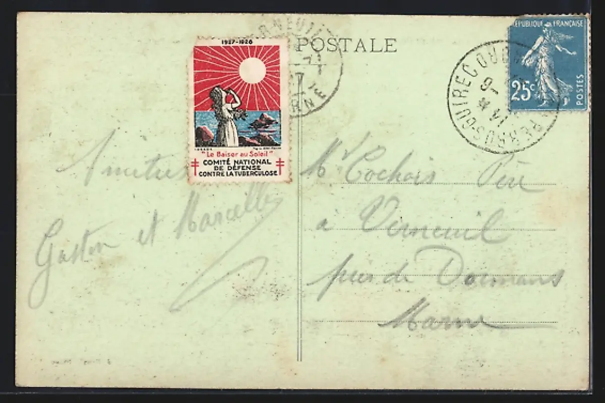 Personenbezogene Daten auf der Rückseite der Karte wurden durch blauen Textmarker unkenntlich gemacht. Die blauen Stellen sind auf die Vorderseite durchgeweicht und wirken sich negativ auf das Postkartenfoto aus