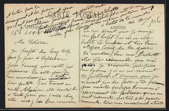 Personenbezogene Daten auf der Rückseite der Karte wurden durch blauen Textmarker unkenntlich gemacht. Die blauen Stellen sind auf die Vorderseite durchgeweicht und wirken sich negativ auf das Postkartenfoto aus