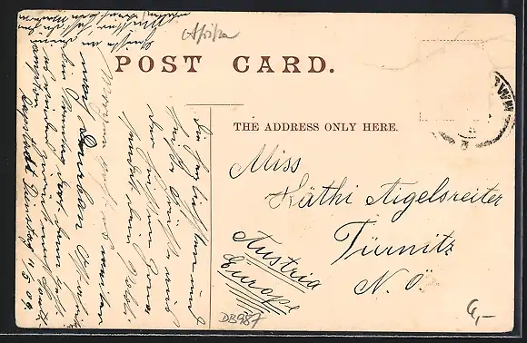 alte Ansichtskarte, gelaufen, Stempelspur, Briefmarke entfernt, rückseitig Oberflächenschaden, guter Zustand