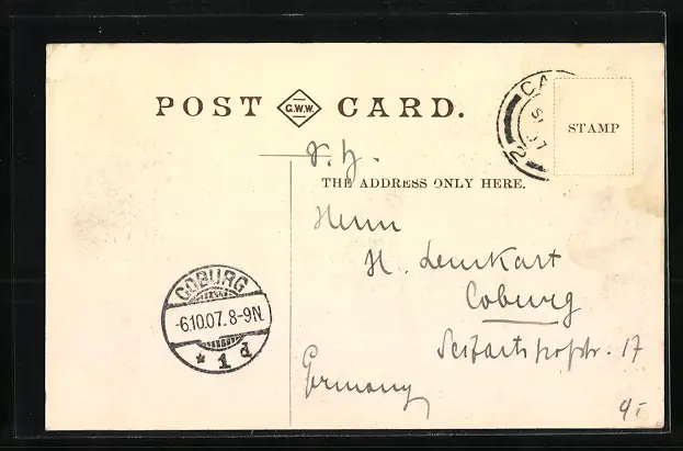 gelaufen 1907, Briefmarke entfernt, Eckknick oben re., guter Zustand