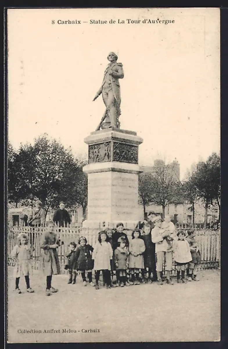 AK Carhaix, Statue de La Tour d`Auvergne avec des enfants devant la clôture