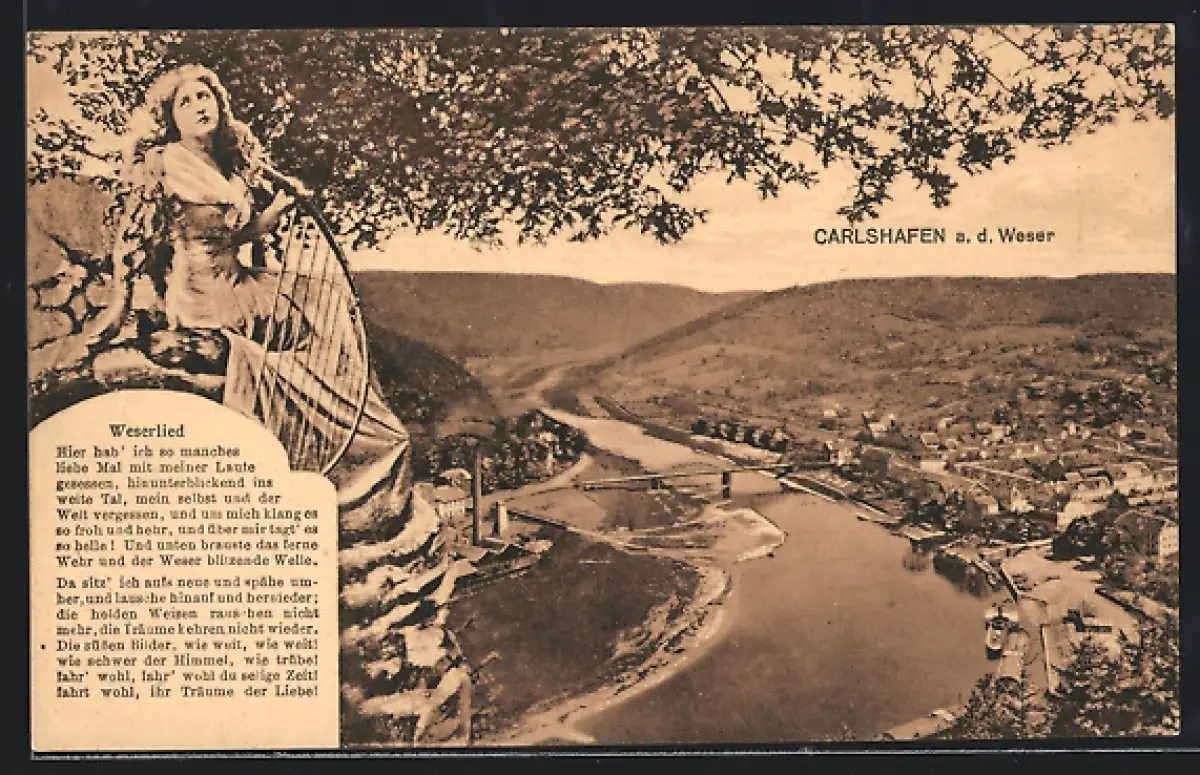 AK Carlshafen a. d. Weser, Weseransicht mit Brücke, Weserlied
