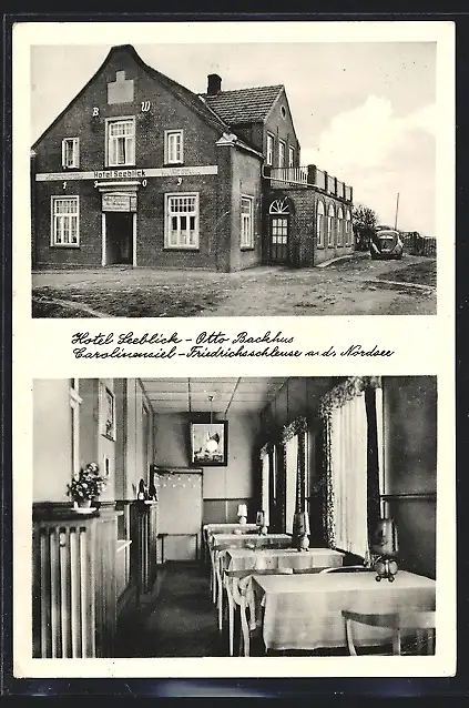 AK Carolinensiel-Friedrichsschleuse a. d. Nordsee, Das Hotel Seeblick mit Innenansicht, Inh. Otto Backhus
