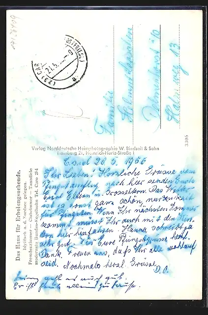 Personenbezogene Daten auf der Rückseite der Karte wurden durch blauen Textmarker unkenntlich gemacht. Die blauen Stellen sind auf die Vorderseite durchgeweicht und wirken sich negativ auf das Postkartenfoto aus