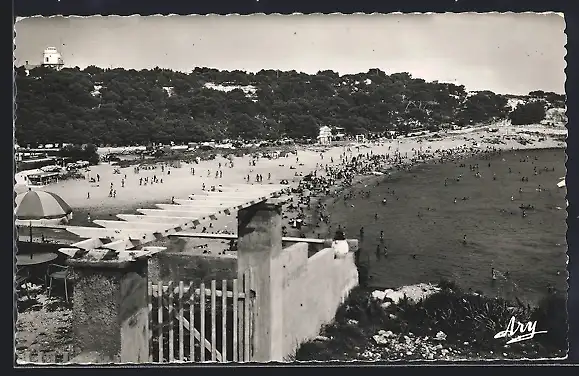 AK Carro, Vue de la plage du Verdon animée par des baigneurs et entourée de pins