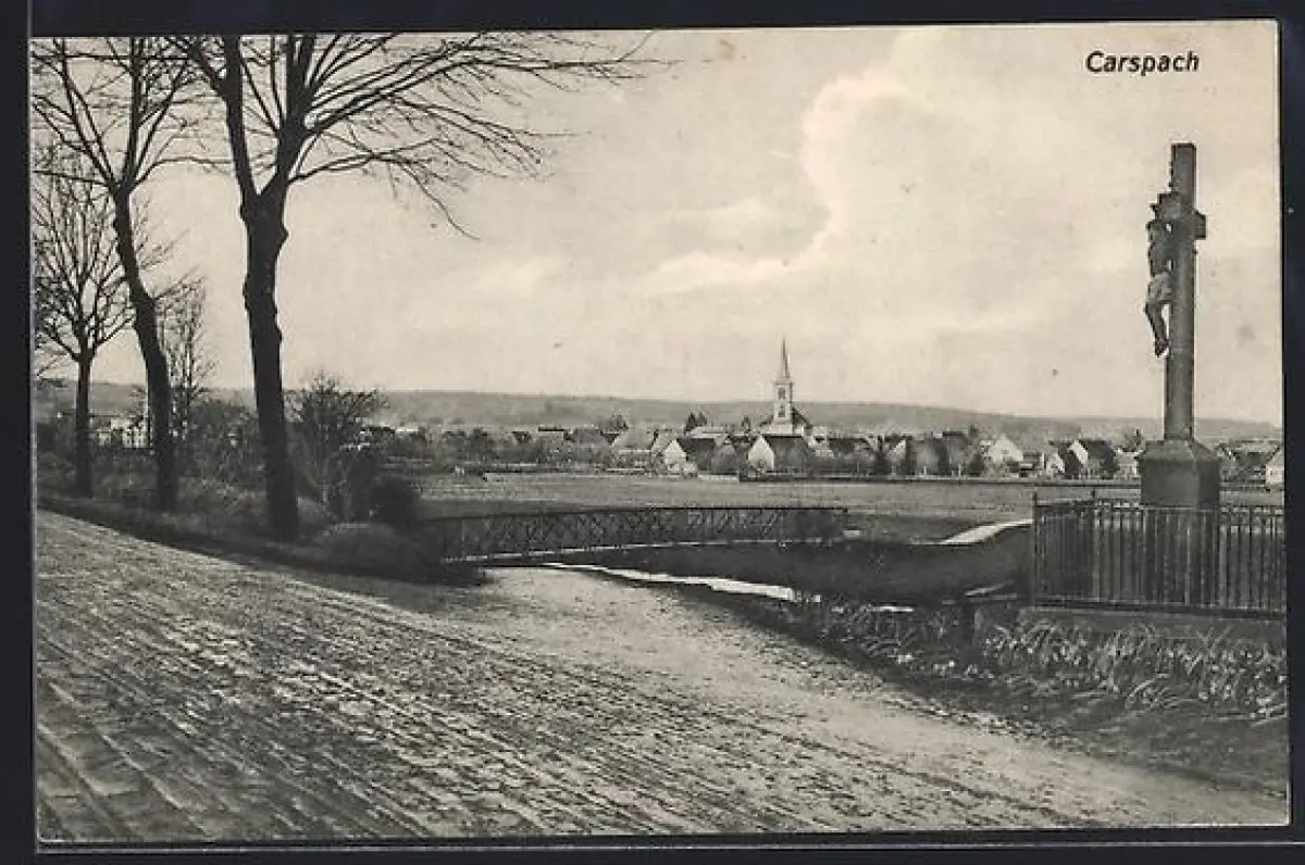 AK Carspach, Vue sur le village avec croix au premier plan et route bordée d`arbres
