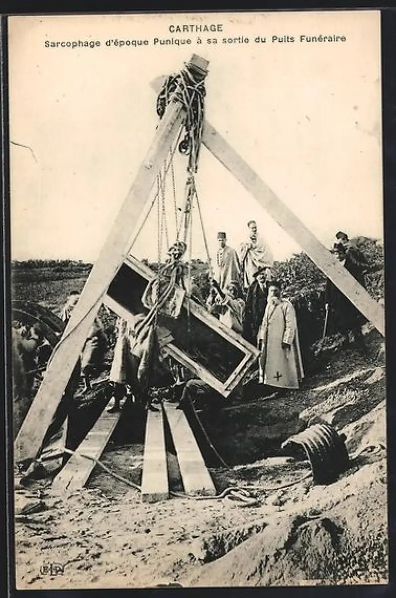 AK Carthage, Sarcophage d'époque Punique à sa sortie du Puits Funéraire