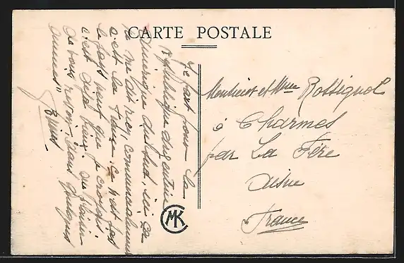 Personenbezogene Daten auf der Rückseite der Karte wurden durch blauen Textmarker unkenntlich gemacht. Die blauen Stellen sind auf die Vorderseite durchgeweicht und wirken sich negativ auf das Postkartenfoto aus