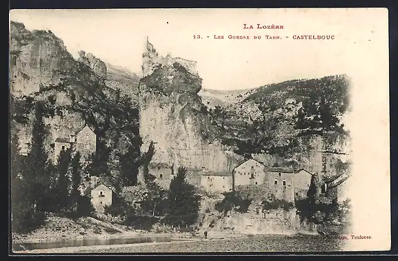 AK Castelbouc, Vue des Gorges du Tarn et des maisons troglodytes