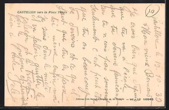 AK Castillon, Vue vers la Place Thiers avec bâtiments et arbres alignés