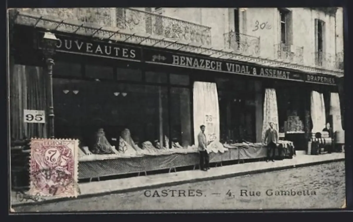 AK Castres, Magasin Bénazech Vidal & Assémat, 4 Rue Gambetta, vue extérieure des étalages de draperies