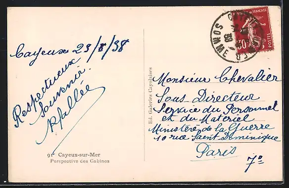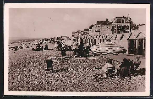 AK Cayeux-sur-Mer, Perspective des cabines sur la plage avec parasols et promeneurs