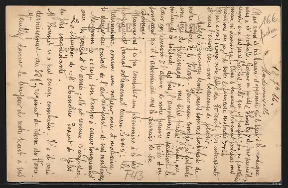 Personenbezogene Daten auf der Rückseite der Karte wurden durch blauen Textmarker unkenntlich gemacht. Die blauen Stellen sind auf die Vorderseite durchgeweicht und wirken sich negativ auf das Postkartenfoto aus