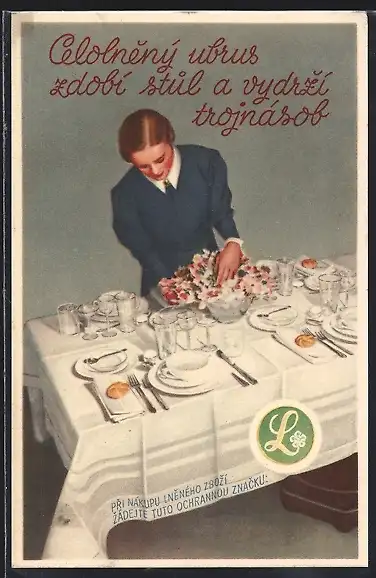 AK Celolneny ubrus zdobi stul a vydrzi trojnásob..., Essgeschirr, Werbung