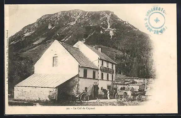AK Ceyssat, Le Col de Ceyssat avec vue sur la montagne et auberge avec calèches