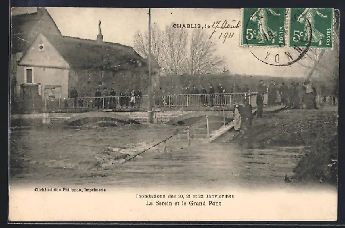 AK Chablis, Inondations des 20, 21 et 22 Janvier 1910, Le Serein et le Grand Pont