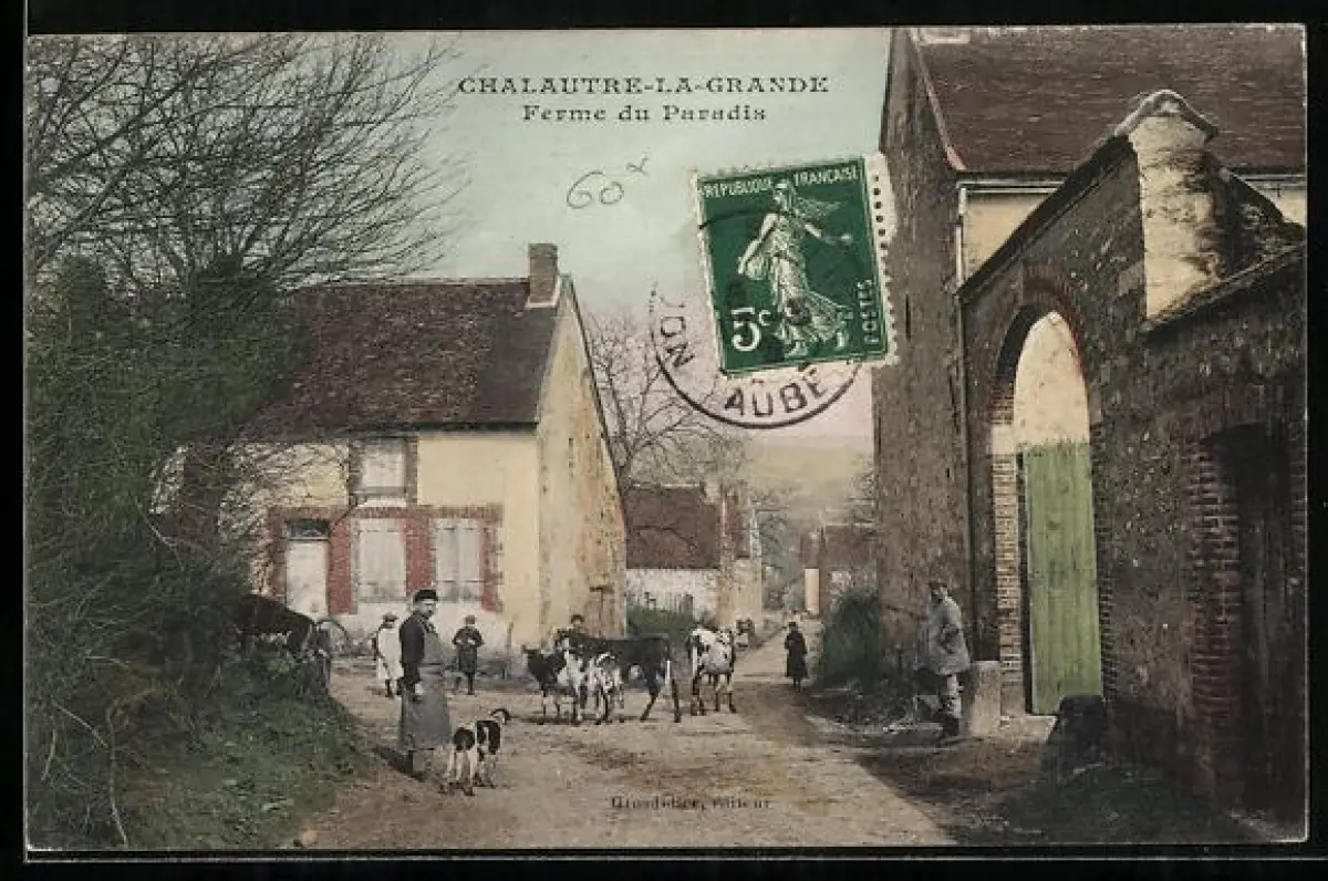 AK Chalautre-la-Grande, Ferme du Paradis avec des villageois et des animaux dans la rue