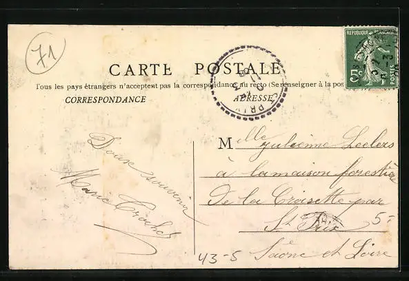 Personenbezogene Daten auf der Rückseite der Karte wurden durch blauen Textmarker unkenntlich gemacht. Die blauen Stellen sind auf die Vorderseite durchgeweicht und wirken sich negativ auf das Postkartenfoto aus